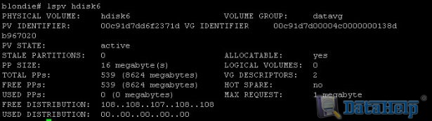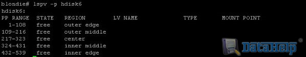 2.列出PV的属性 lspv hdisk## 该命令输出VG Descriptor和VG State的信息。 3.列出PV上物理分区的分布情况 lspv –p hdisk##